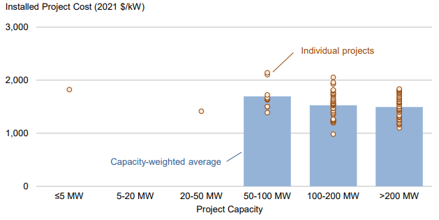On the flip side, diversification and smaller projects have advantages. The economies of scale that drove large hydro and coal plants are diminished with respect to modern renewable energy. Renewable energy is pretty modular and scalable. Wind farms are collections of turbines replicated across a ridgeline, solar farms are just loads of panels and even most utility-scale batteries are just smaller battery packs wired up together. This means, unlike the giant coal and nuclear turbines, where you’re dealing with steam and pressure and heat etc., the efficiencies of going bigger aren’t that pronounced.
