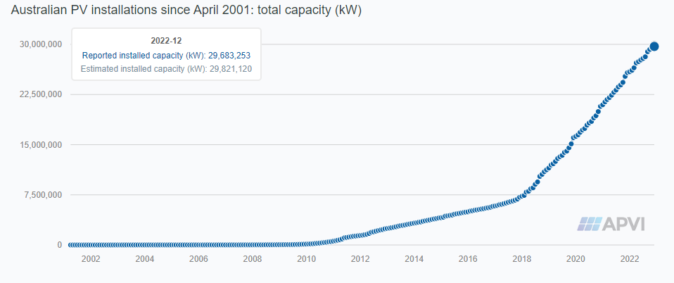 On the flip side, the advantages of smaller projects are that you can locate them closer to where they’ll be used. At the extreme end, instead of building a whole solar farm, you can just stick panels on your roof. Australia has had some generous and long running policies in place to promote the installation of rooftop solar, but even as these incentives have reduced over time, rooftop solar hasn’t slowed down. The scale of rooftop solar in Australia is incredible! Almost 30GW.